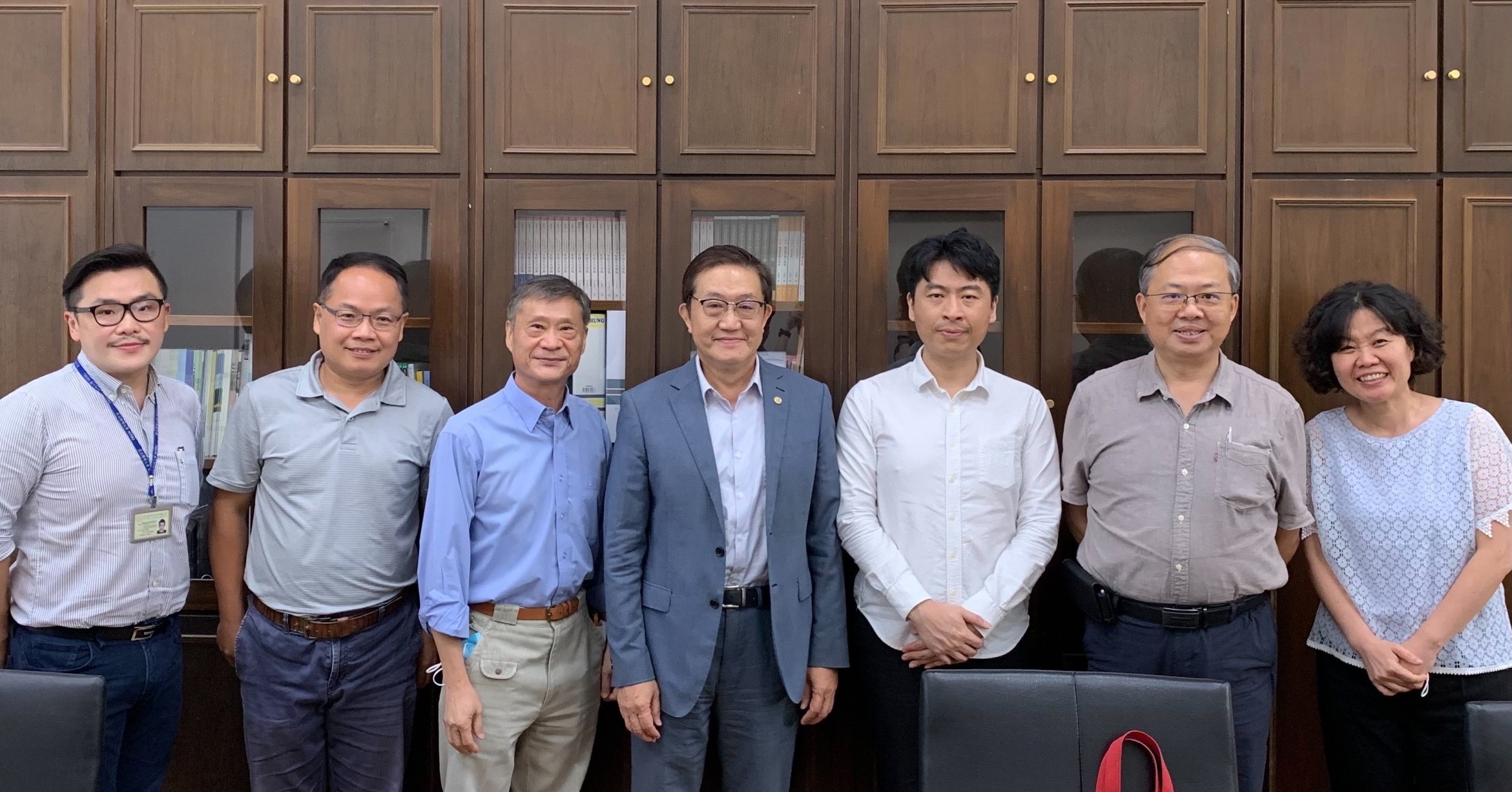 (左起為本校環境與職業衛生研究所紀凱獻所長、醫學生物技術暨檢驗學系黃智生副教授、生物醫學工程學系楊世偉教授、本中心郭旭崧諮議委員、臺北醫學大學公共衛生學系莊凱任教授、生物醫學影像紀放射科學系陳志成教授、本中心黃彥芳執行長)