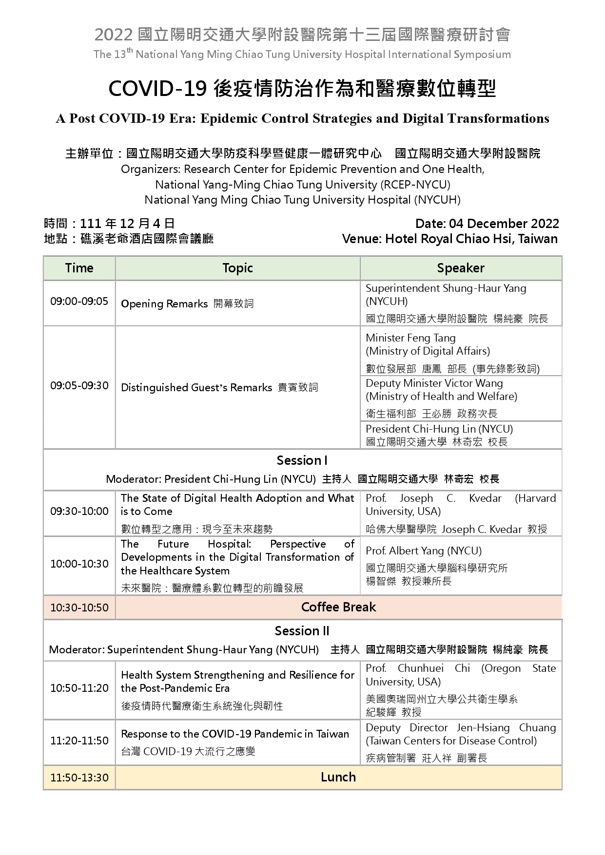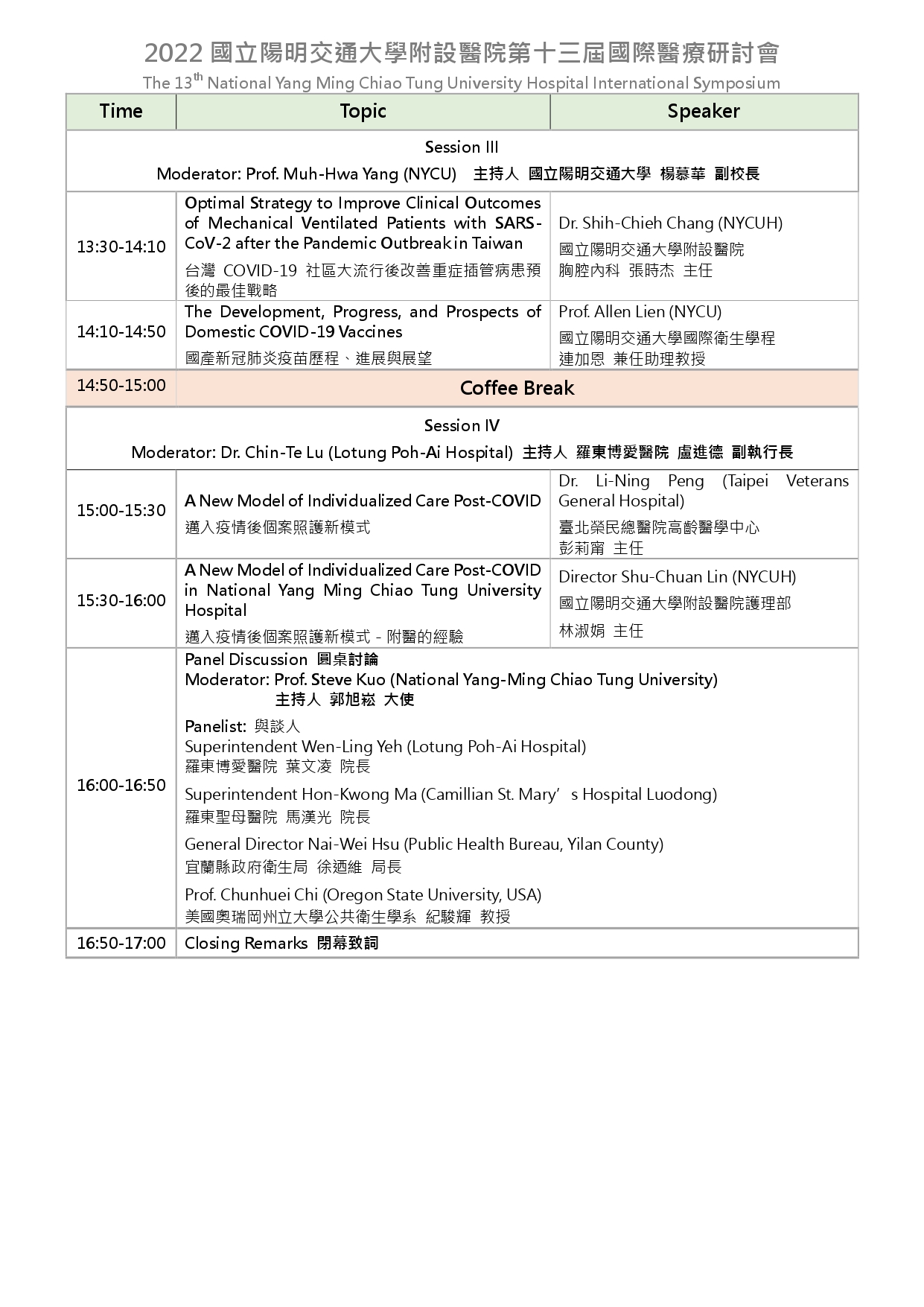 及美國奧瑞岡州立大學教授紀駿輝主講「後疫情時代醫療衛生系統強化與韌性」;莊人祥主講「台灣COVID-19大流行之應變」。下午場則為「邁入疫情後個案照顧新模式」相關議題;最後圓桌討論,結束1天各界專家學者互相交流座談會,藉以拓展國際視野、激盪出新思維。