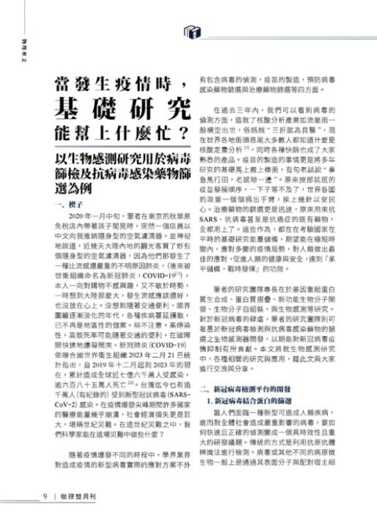 當發生疫情時,基礎研究能幫上甚麼忙? 以生物感測研究用於病毒篩檢及抗病毒感染藥物篩選為例 全文詳見物理雙月刊NO.45中文版 2023年4月 第二期 第9頁-第16頁 資訊來源:博客來 https://www.books.com.tw/products/R030093542?loc=P_0004_001